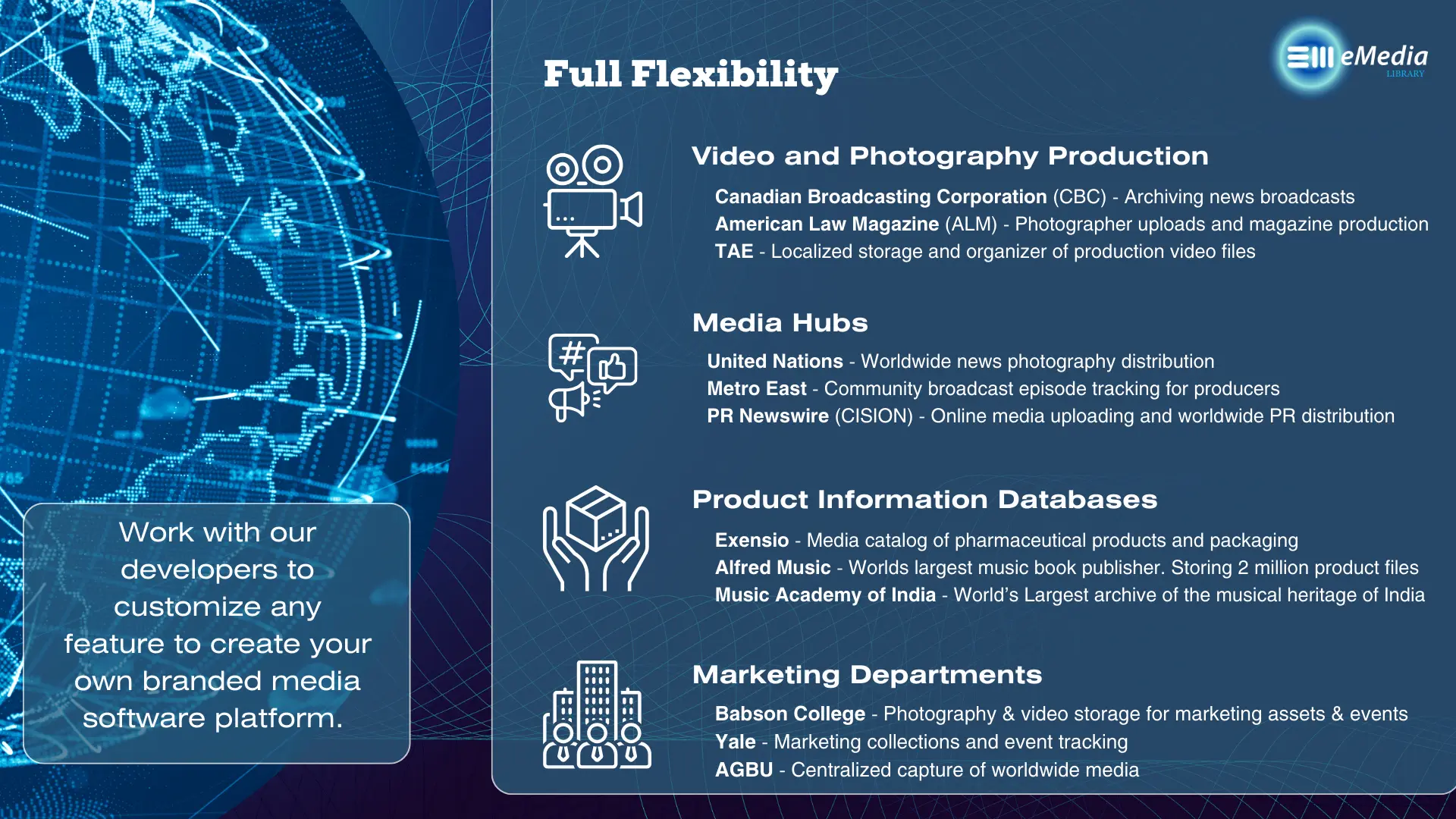We welcome programmers and integrators creating their own integrations and extensions. We keep all our source code available on GitHub EnterMedia Community area. The architect of eMediaLibrary, Christopher Burkey is also available to meet with developers.